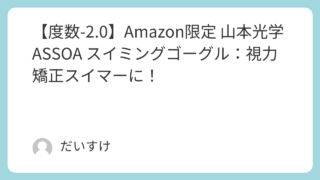スイムゴーグル 【度数-2.0】Amazon限定 山本光学 ASSOA スイミングゴーグル:視力矯正スイマーに! 度付きスイミングゴーグルをお探しですか?Amazon限定【ASSOA】は、度数-2.0で視力矯正をサポート。山本光学製、安心の日本製です。UVカット&くもり止め機能付きで1,544円!快適なスイミングを体験ください。 2026.04.12 スイムゴーグル